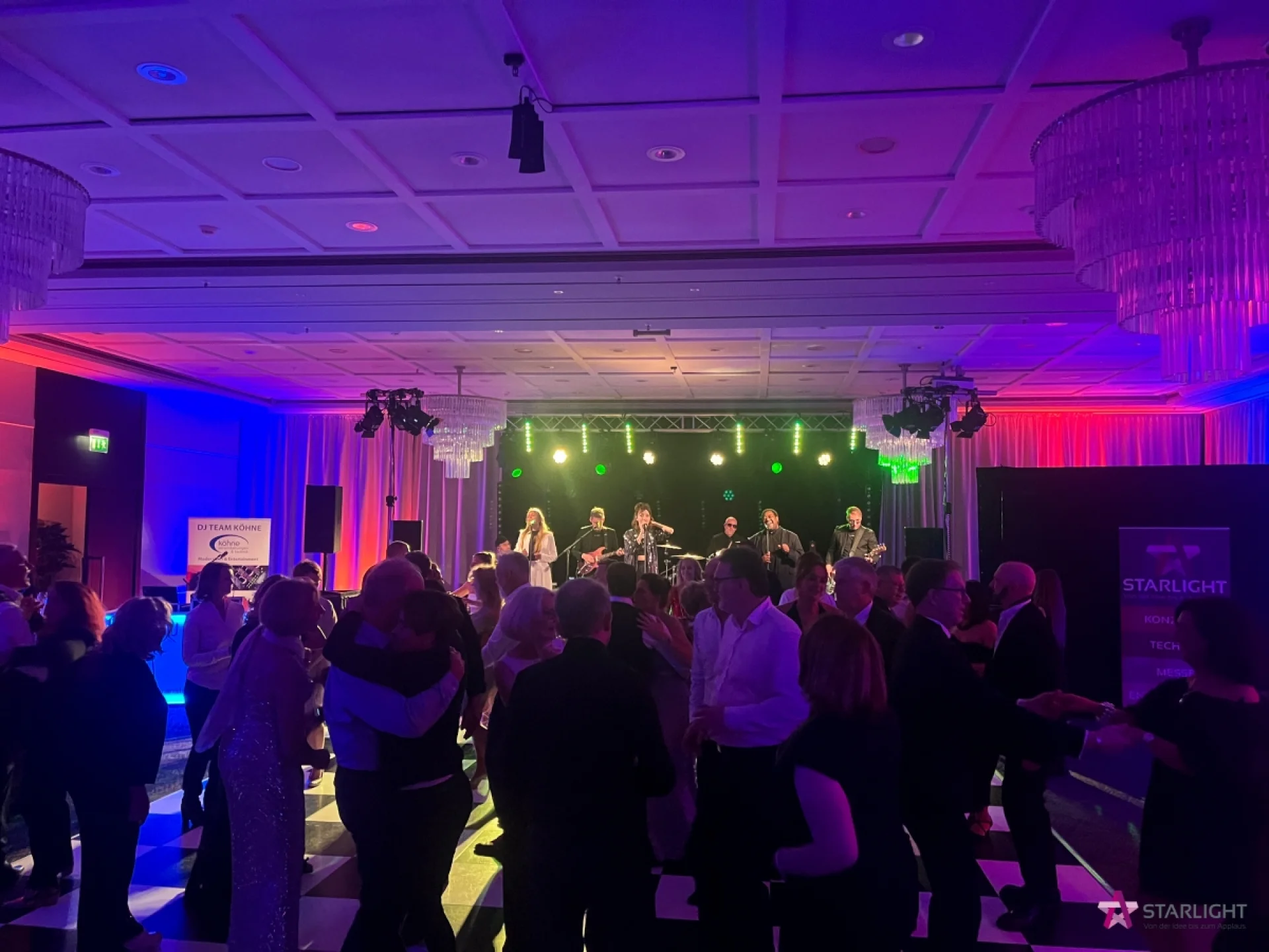 Für das Osnabrücker Gala-Event lieferten wir eine Bühne sowie Licht-, Ton- und Bandtechnik und einen großzügigen Tanzboden in Schachbrettoptik. Mit abgestimmter Ambientebeleuchtung setzten wir festliche Akzente. Um die passende Beschallung im Foyer kümmerten wir uns ebenfalls. Für die musikalische Unterhaltung der Ball-Gäste standen im Wechsel die Berliner Partyband „The Live Society“ sowie „DJ Jens Köhne“ auf der Bühne. Unser Team war für die technische Betreuung durchgehend vor Ort.