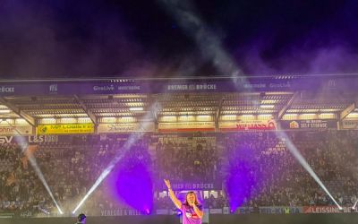 Wir waren im Auftrag des VfL Osnabrück als Event Dienstleister im Einsatz. Bereits im Vorfeld übernahmen wir die Planung und Visualisierung des Rahmenprogramms und koordinierten während des Events die technischen Abläufe vor Ort. Beim Stadioneinlauf von Eule sorgten wir mit Pyrotechnik und Showlicht für Gänsehautmomente. Während der Ehrung kreierten wir mit Konfetti Stadium Shootern eine einmalige, effektvolle Atmosphäre. In Summe verlegten wir hunderte Meter Strom- und Signalkabel. Unsere Outdoormovinglights sorgten dafür, dass außerhalb des Stadions der Himmel Lila Weiß illuminiert wurde. Außerdem lieferten wir das Technik-Equipment für den Auftritt von Christian Steiffen sowie die Beschallungstechnik und die Illumination für den VIP-Bereich, in dem unser DJ-Kollege JonnyBeach für die musikalische Stimmung sorgte.